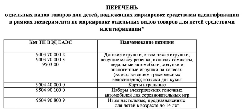 Минпромторг предложил провести эксперимент по маркировке отдельных видов товаров для детей с 1 декабря 2023 года по 1 декабря 2024 года